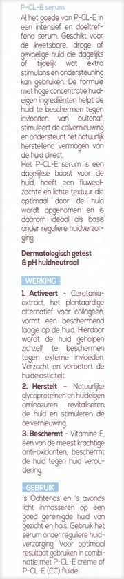 P-CL-E serum is een dagelijkse boost voor de huid. Het serum heeft een lichte en fluweelzachte textuur die optimaal door de huid wordt opgenomen. P-CL-E serum is daarom ideaal als basis voor dagelijkse huidverzorging. Deze multifunctionele cr?me is geschikt voor alle huidtypen en is speciaal ontwikkeld voor de: