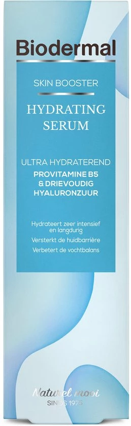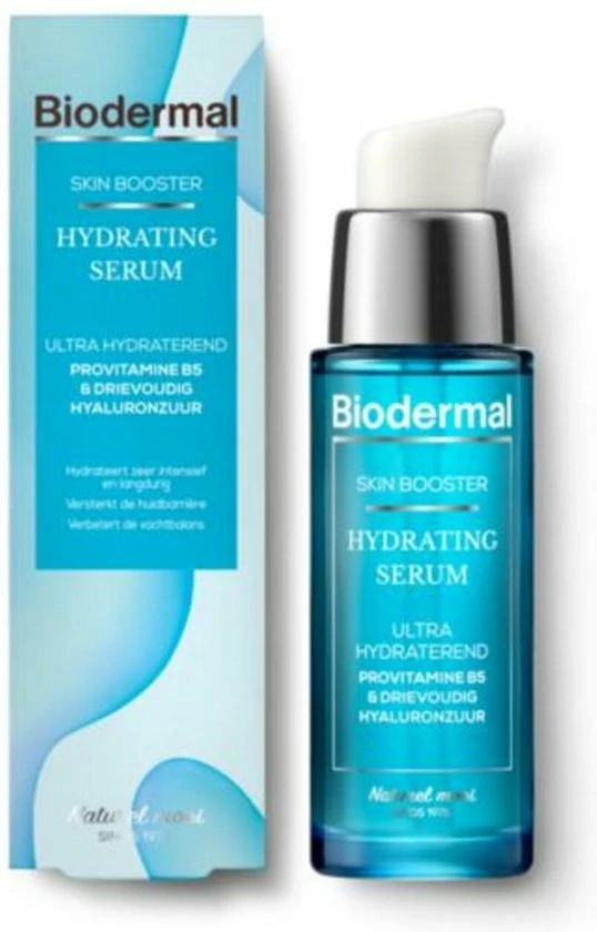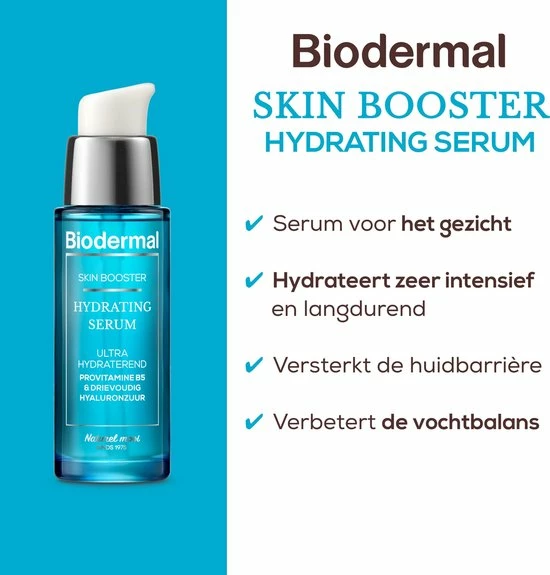 Nieuw van Biodermal Biodermal Skin Booster Hydrating serum. Biodermal Hydrating Serum is een krachtige en hoog geconcentreerde skin boosterformule. De combinatie van provitamine B5 en drievoudig hyaluronzuur hydrateert intensief door een drievoudig werkend hyaluronzuur en geeft de huid intensieve hydratatie op drie niveaus: