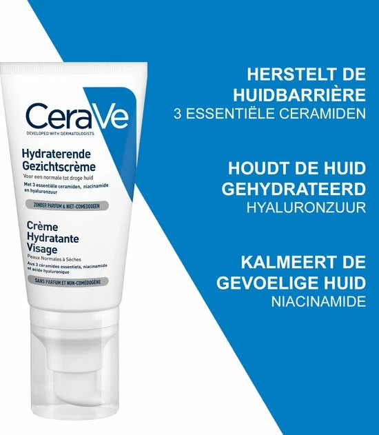 De huid heeft behoefte aan langdurige hydratatie, vooral een droge huid snakt hier naar. De gezichtscrème van CeraVe, ideaal voor de normale tot droge huid, bevat drie essentiële ceramiden om de huidbarrière te versterken, hydraterende hyaluronzuur en verzachtende niacinamide, allemaal in een niet-comedogene en hypoallergene formule. Deze formule is rijk, maar heeft een lichte textuur dankzij de MVE technologie, die zorgt voor een afgifte van een homogene concentratie aan hydraterende actieve stoffen gedurende de hele dag. Deze crème kan zowel ‘s ochtends als ‘s avonds voor het slapengaan gebruikt worden.