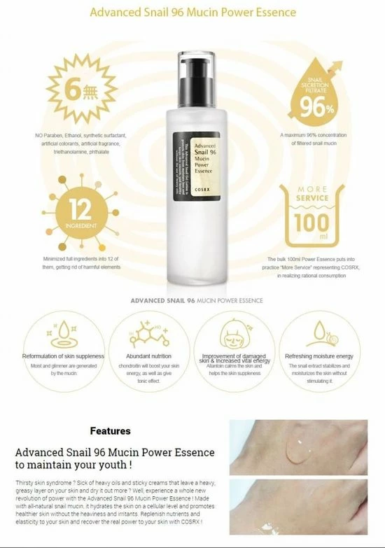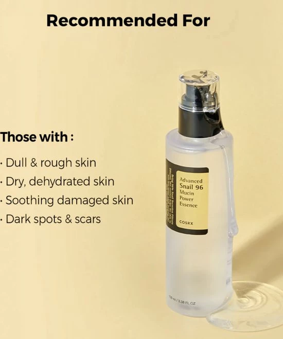 Een hydraterende essence geformuleerd met 96% slakkenslijm om de huid te kalmeren en beschadigingen te herstellen. Het bevat ook vitamines om de huid te voeden en levert een hoge dosis hydratatie die licht en fris aanvoelt. Geschikt voor alle huidtypen, inclusief de gevoelige huid. Voor het beste resultaat, combineer met de COSRX Advanced Snail 92 All in one Cream.