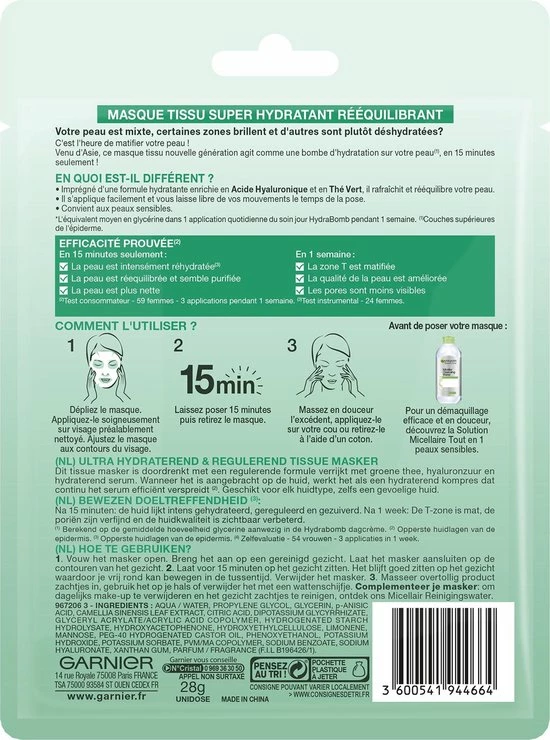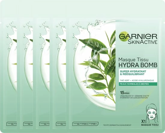 Het Garnier SkinActive Hydra Bomb Sheet Masker met Groene Thee en Hyaluronzuur