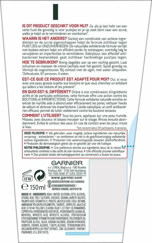Garnier Ultra Exfolierende Reinigende Creme Anti-PuistjesDit product is ideaal voor jou als je een huid hebt die gevoelig is voor mee-eters die je graag zou willen verwijderen en waarvan je wilt voorkomen dat ze terugkeren. Ook vermindert de formule onzuiverheden. Dankzij krachtige micro-scrubdeeltjes worden mee-eters verwijderd. Verrijkt met een natuurlijk regenererend extract, werkt de formule het ontstaan van onzuiverheden tegen. Als gevolg daarvan is je huid zichtbaar verbeterd.