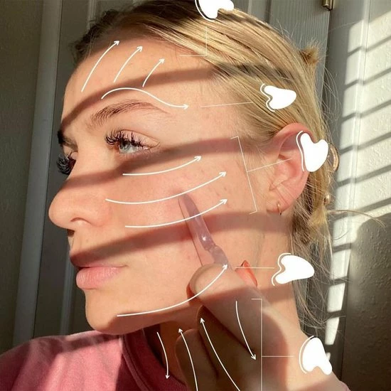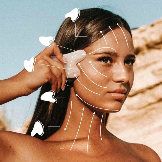 De basistechniek draait om een opwaartse beweging met lichte druk. Plaats de platte kant van de tool in een hoek van 45 graden op je gezicht en beweeg de steen. in vloeiende bewegingen naar boven en buiten vanaf het midden van je gezicht.