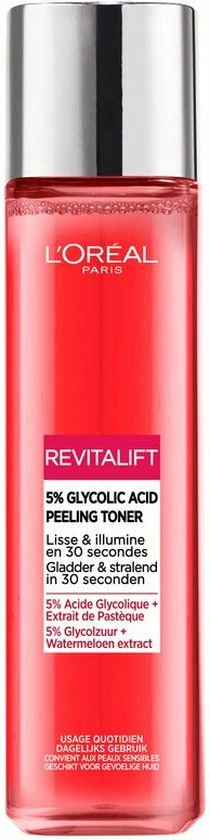 Schadelijke invloeden van buitenaf, samen met het ouder worden van de huid, belemmeren het vermogen van onze huid om zich te vernieuwen. Dit leidt tot een opeenhoping van een dode, droge en doffe huid aan de oppervlakte. Hierom is het belangrijk deze L’Oréal Paris Revitalift 5% glycolzuur peeling toner te gebruiken om je huid er jong, soepel en stralend uit te laten zien.
