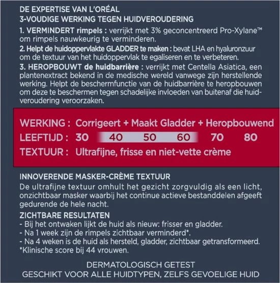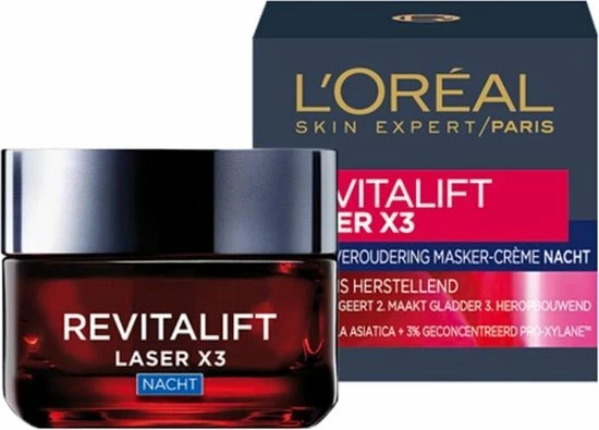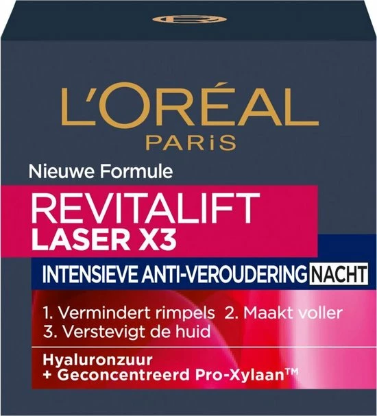 De anti-rimpel nachtcrème is verrijkt met Pro-Xylaan om rimpels nauwkeurig te verminderen. Ook wordt het steunweefsel in de huid versterkt, wat zorgt voor het opvullen van de huid. De nachtcrème is verrijkt met hyaluronzuur om de textuur van de huidoppervlakte te egaliseren en te verbeteren. Dit zorgt voor een zichtbaar jongere uitstraling. De toegevoegde Centella Asiatica helpt de beschermfunctie van de huidbarrière te heropbouwen om deze te beschermen tegen schadelijke invloeden van buitenaf. De Laser X3 nachtcrème is aanbevolen voor vrouwen vanaf 30 jaar.