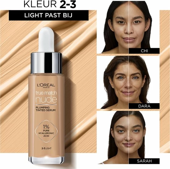 Het L’Oréal True Match getint serum is een verzorgend serum met hyaluronzuur en lichte make-up dekking in één. Hyaluronzuur ondersteunt de vochthuishouding in de huid en laat de huid er gladder en voller uitzien. De toegevoegde kleurpigmenten zorgen voor een lichte en natuurlijke dekking voor een egale en stralende huid. Het make-up serum heeft een dunne structuur waardoor deze goed blend met de huid voor een natuurlijke finish. De formule is non-comedogeen, dit houdt in dat de formule de poriën niet verstopt en is ideaal voor een gevoelige of onrustige huid. De 9 kleuren zijn speciaal ontwikkeld aan de hand van een multi-culturele beauty studie, om te garanderen dat ze bij een grote diversiteit aan huidstinten passen.