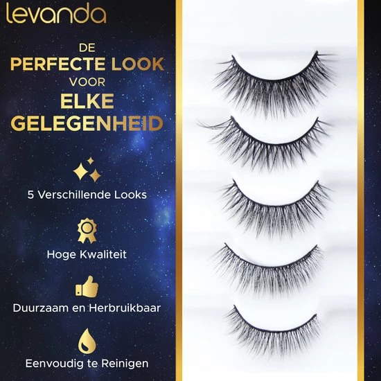 Dankzij de hoge kwaliteit ogen de nepwimpers zeer natuurlijk, het 3D-effect zorgt bovendien voor volumineuze wimpers. Je ontvangt een set van 5 verschillende magnetische wimpers zodat je voor elke gelegenheid de juiste look kunt cre?ren. Van een subtiele naturel look tot een echt va-va-voom effect: met de 5 verschillende wimperextensions van Levanda kan het allemaal.