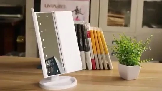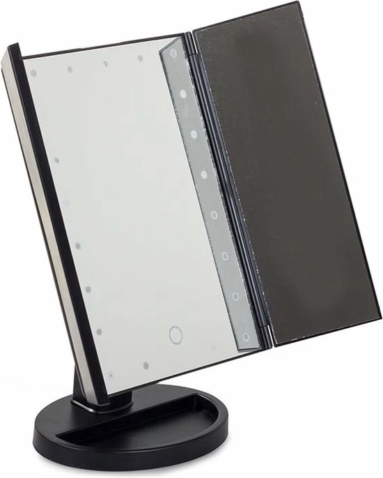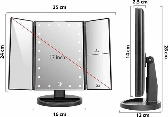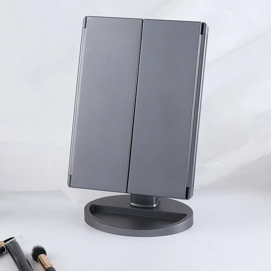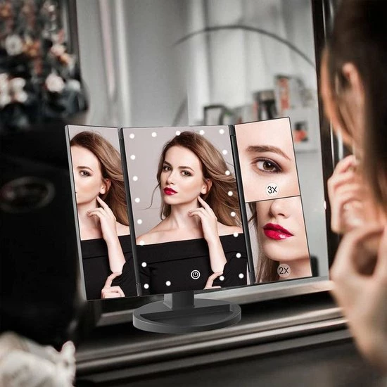 Cosmeticaspiegel met vergroting. Voorzien van 22 Led lichtjes, de led lichtjes kunnen geactiveerd worden door te klikken op de cirkel midden op de spiegel. Met 2x en 3x vergrotingsontwerp. Driebladige en stabiele standaard en 180 graden rotatieontwerp: het drievoudige ontwerp biedt een brede kijkhoek en de stabiele standaard biedt 180 graden vrije rotatie, volledig instelbaar in elke positie, voor een comfortabele kijkhoek.