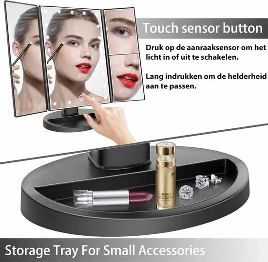 Ingebouwde instelbare verlichte helderheid, perfecte pasvorm voor make-up in het donker of slecht licht. LED-verlichting aan / uit bestuurd door de aanraaksensorschakelaar en lang indrukken kan schakelen om de helderheid van de lichten aan te passen.