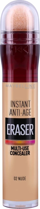 Met een super-creamy textuur is deze Instant Anti Age Eraser 02 Nude concealer zacht voor de huid, en door de pigmentatie zeer dekkend. Door de unieke formule van de Maybelline concealer trekt de liquid concealer niet in de lijnen van de huid voor een egaal en glad resultaat. De formule bevat Goji bes extract, wat de huid rondom de ogen hydrateert en daarmee fijne lijntjes tegengaat. Ook bevat het Haloxyl, wat donkere kringen onder de ogen neutraliseert. De gehele range Instant Anti Age Eraser concealers heeft meer kleuren dan ooit zodat je de kleur kunt vinden die bij jouw huid past.