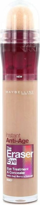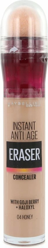 Met een super-creamy textuur is deze Instant Anti Age Eraser 04 Honey concealer zacht voor de huid, en door de pigmentatie zeer dekkend. Door de unieke formule van de Maybelline concealer trekt de liquid concealer niet in de lijnen van de huid voor een egaal en glad resultaat. De formule bevat Goji bes extract, wat de huid rondom de ogen hydrateert en daarmee fijne lijntjes tegengaat. Ook bevat het Haloxyl, wat donkere kringen onder de ogen neutraliseert. De gehele range Instant Anti Age Eraser concealers heeft meer kleuren dan ooit zodat je de kleur kunt vinden die bij jouw huid past.