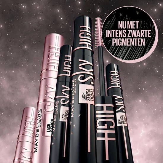 Ga verder dan Sky High met Sky High Cosmic Black! Nu eindeloos lengte, volume en intense zwarte pigmenten met de Maybelline Lash Sensational Sky High Cosmic Black mascara voor sky high impact vanuit elke hoek.