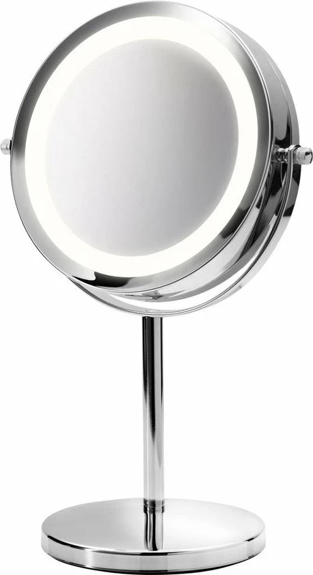 Met deze Medisana CM 840 – Make-up spiegel kan dagelijkse gezichtsverzorging thuis nu net zo professioneel worden uitgevoerd als bij de schoonheidsspecialist. Dankzij het grote spiegeloppervlak die de reflectie tot maar liefst 5x vergroot en de uniforme verlichting in de vorm van een ring met energiezuinige witte LEDs, is een poriën diepe en zeer nauwkeurige verzorging mogelijk. De cosmeticaspiegel staat stevig op een stabiele voet en is dankzij de 4 AAA batterijen toch overal te plaatsen waar gewenst. Voor een comfortabele gezichtsverzorging hoef je dus niet meer ver voorover gebukt te zitten of te manoeuvreren in een ongemakkelijke positie: de Medisana Cosmeticaspiegel zorgt voor het perfecte gezichtsbeeld op de perfecte plaats