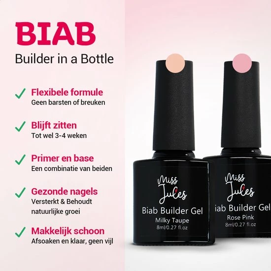Acrylnagel effect zonder je nagels te beschadigen? Cre?er de perfecte manicure met het Miss Jules? BIAB Starter Pakket. Onze BIAB builder gel verzorgt en verstevigt de eigen nagels en geeft een langdurig, glanzend resultaat. Bij elke BIAB behandeling worden je eigen nagels sterker!