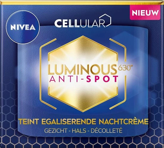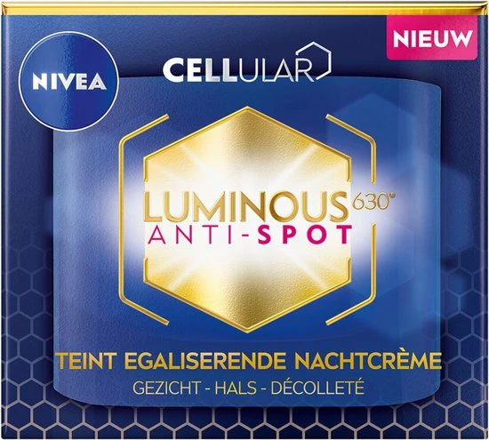 Gun je gezicht, hals en decollet? een verzorging met de LUMINOUS630? ANTISPOT Teint Egaliserende Nachtcr?me. Elke ochtend een frisse en gerevitaliseerde huid en dag na dag een meer egale en stralende teint. Zichtbaar resultaat na 4 weken*. ELKE NACHT: De formule met Luminous630 en hyaluronzuur verstevigt de huid en laat pigmentvlekken zichtbaar lichter worden. Op een gereinigde huid: masseer ‘s avonds in op gezicht, hals en decollet?. Producten met LUMINOUS630? max. 4 maal per dag aanbrengen.