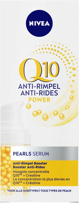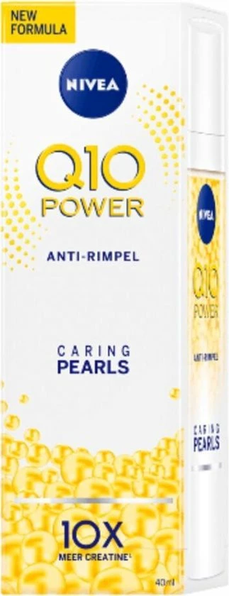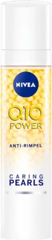 NIVEA Q10 POWER Anti-Rimpel + Verstevigende Caring Pearls bevatten de hoogste concentratie Q10 binnen de NIVEA Q10 POWER lijn en zijn gecombineerd met een hydraterende gel. Het resultaat: Een zeer effectief anti-rimpel product. De formule met het krachtige antioxidant Q10 en Creatine, zorgt voor een stevigere huid en verminderd rimpels zichtbaar.