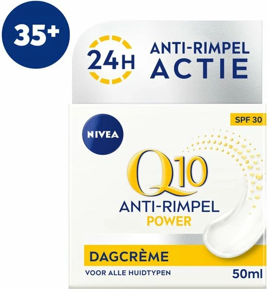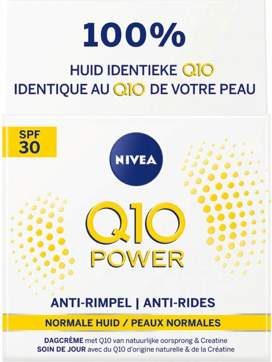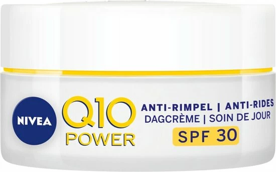 NIVEA Q10POWER Anti-Rimpel Dagcr?me SPF30 combineert het cel-actieve Q10 met 10X meer Creatine vergeleken met voorgaande formules. Het bestrijdt effectief fijne lijntjes en rimpels en zorgt voor een voelbaar stevigere huid. SPF30 en UVA/UVB bescherming helpen het ontstaan van nieuwe rimpels door invloeden van buitenaf te voorkomen. De verzorgende formule zorgt bovendien voor intensieve hydratatie.