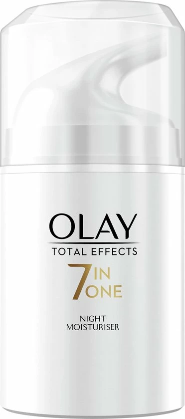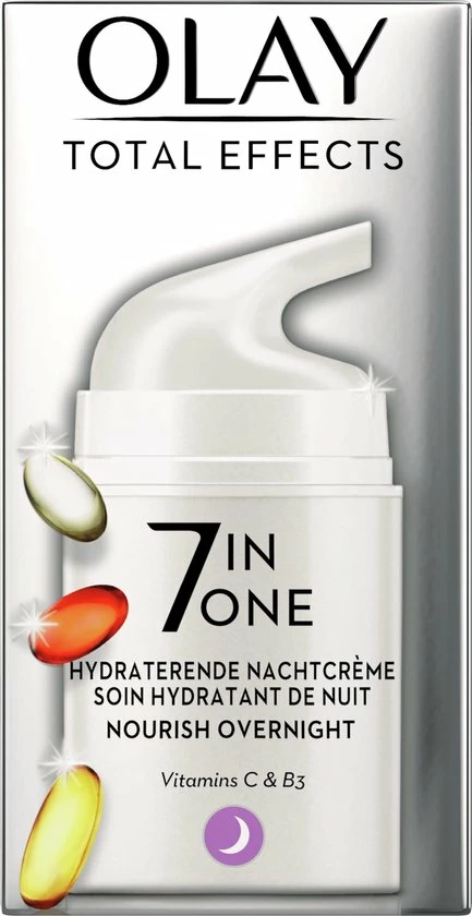 De formule van Olay Total Effects zit vol met vitaminen B3, C, E en Pro-Vitamine B5 die antioxidanten bevatten en de hydratatie en vernieuwing van het huidoppervlak ?s nachts verbeteren.