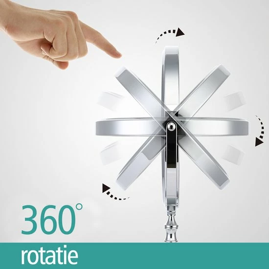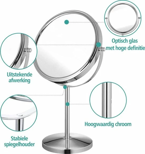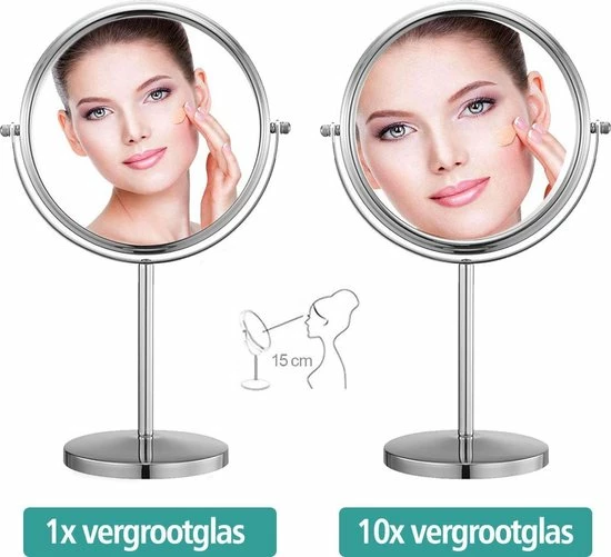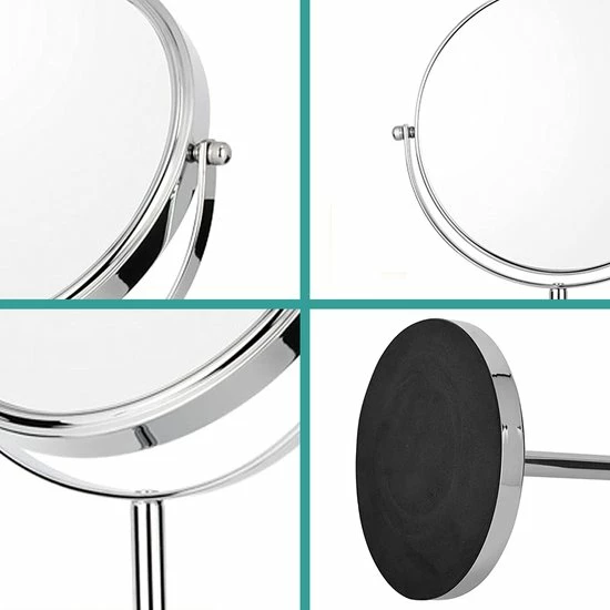 De Make-up Spiegel beschikt ook over een 10 maal vergrotende kant zodat u alle details extra goed kunt zien. U kunt de Make-up Spiegel helemaal roteren zodat u makkelijk kunt switchen tussen de normale en vergrotende kant. De Make-up spiegel is gemaakt van hoogwaardige kwaliteit metaal waardoor deze niet snel zal krassen, slijten of roesten, ook de levensduur word hierdoor aanzienlijk verlengd. Het mooie chromen uiterlijk zorgt ervoor dat dit product strak, hip en tijdloos is waardoor deze overal mooi tot zijn recht zal komen. De onderkant is voorzien van schuimrubber wat zorgt voor extra grip en voorkomt krassen op bijvoorbeeld uw badkamer meubel, tafel of kast.