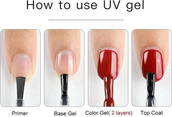 Breng eerst de base coat aan op uw nagel, kies de gewenste nagellak en lak deze af met de top coat.