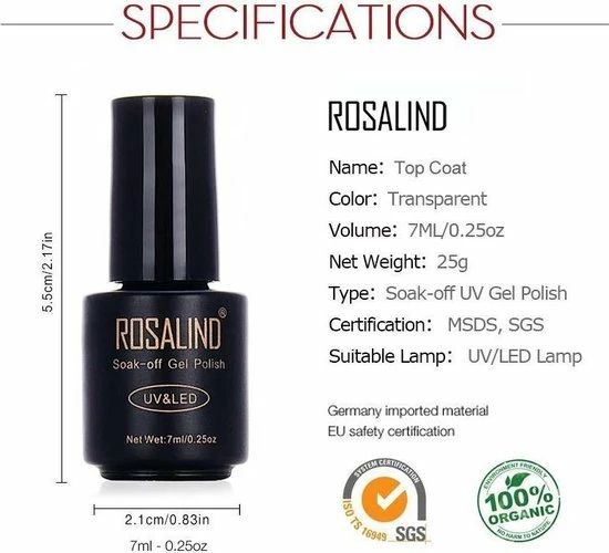 Rosalind is nieuw op de markt, een snel groeiend merk welke u zeker wilt gebruiken. Deze Gelpolish/Gellak lakt zeer prettig en word gebruikt met een Base & Top Coat. Hard uit met een UV of LED lamp.