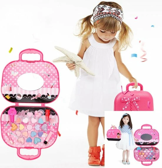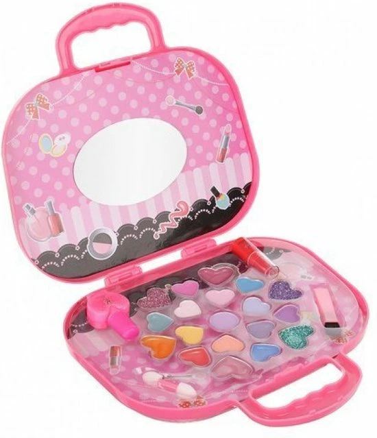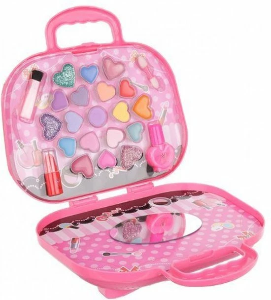 Vind jij het leuk om jezelf op te maken? Dan is deze make-up-koffer met spiegeltje echt iets voor jou! In de set zitten verschillende kleuren lipgloss, oogschaduw en lippenstift. De koffer is gevuld verschillende kleuren lipgloss en oogschaduw in hartjesvorm en lippenstift. Ook zitten er een spiegel in de koffer. De koffer is geschikt vanaf 5 jaar.